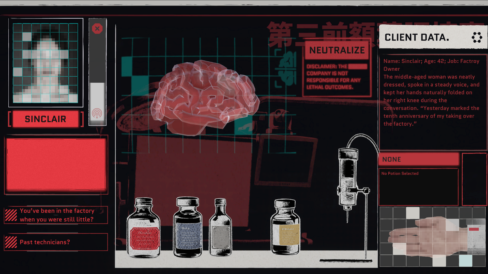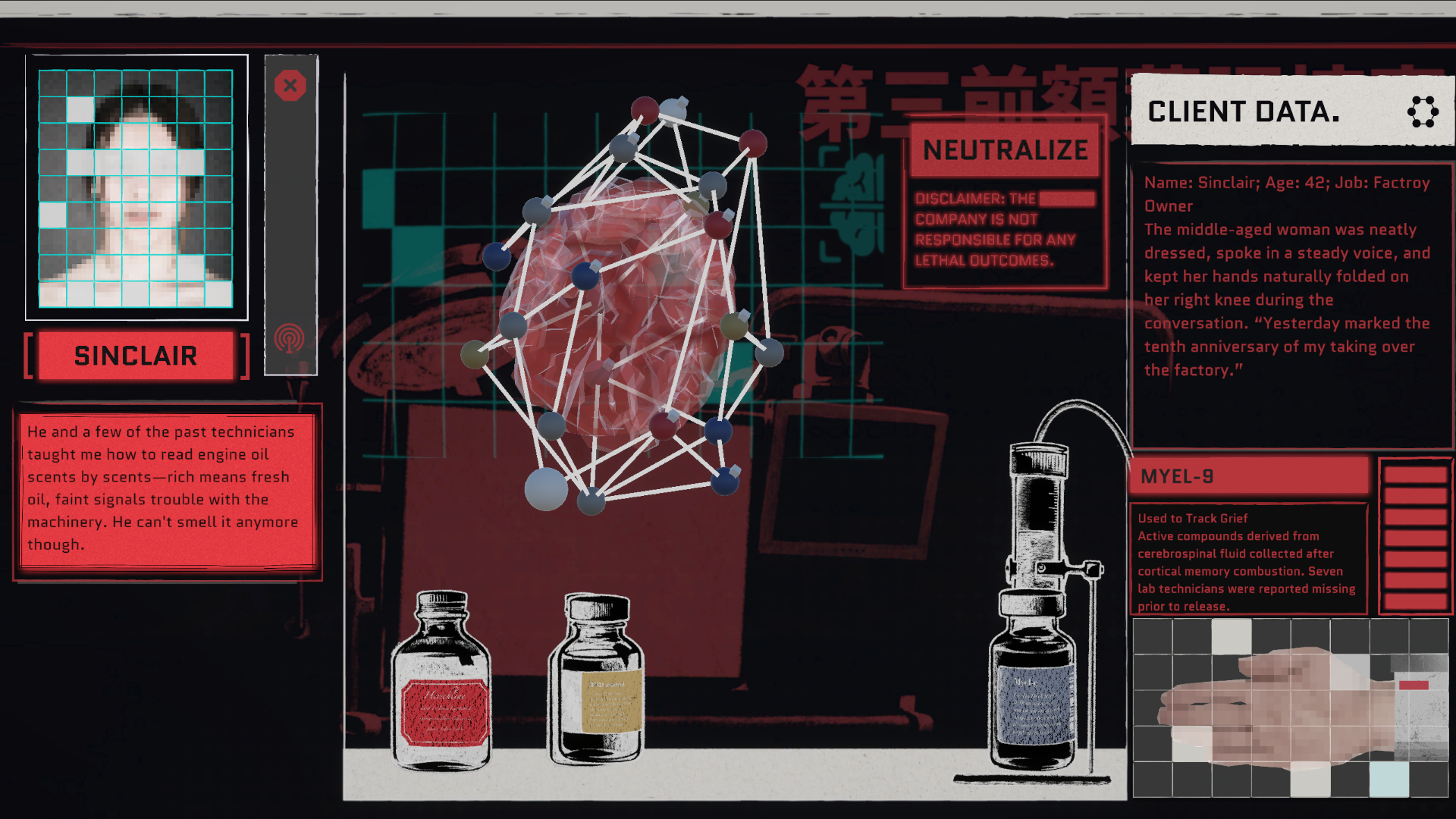 Player takes on the role of a “doctor”, responsible for treating emotions that are not meant to exist. By speaking with clients, player can observe their brain activity, identify abnormally active neurons, and select appropriate medical treatments to guide their consciousness back to stable.